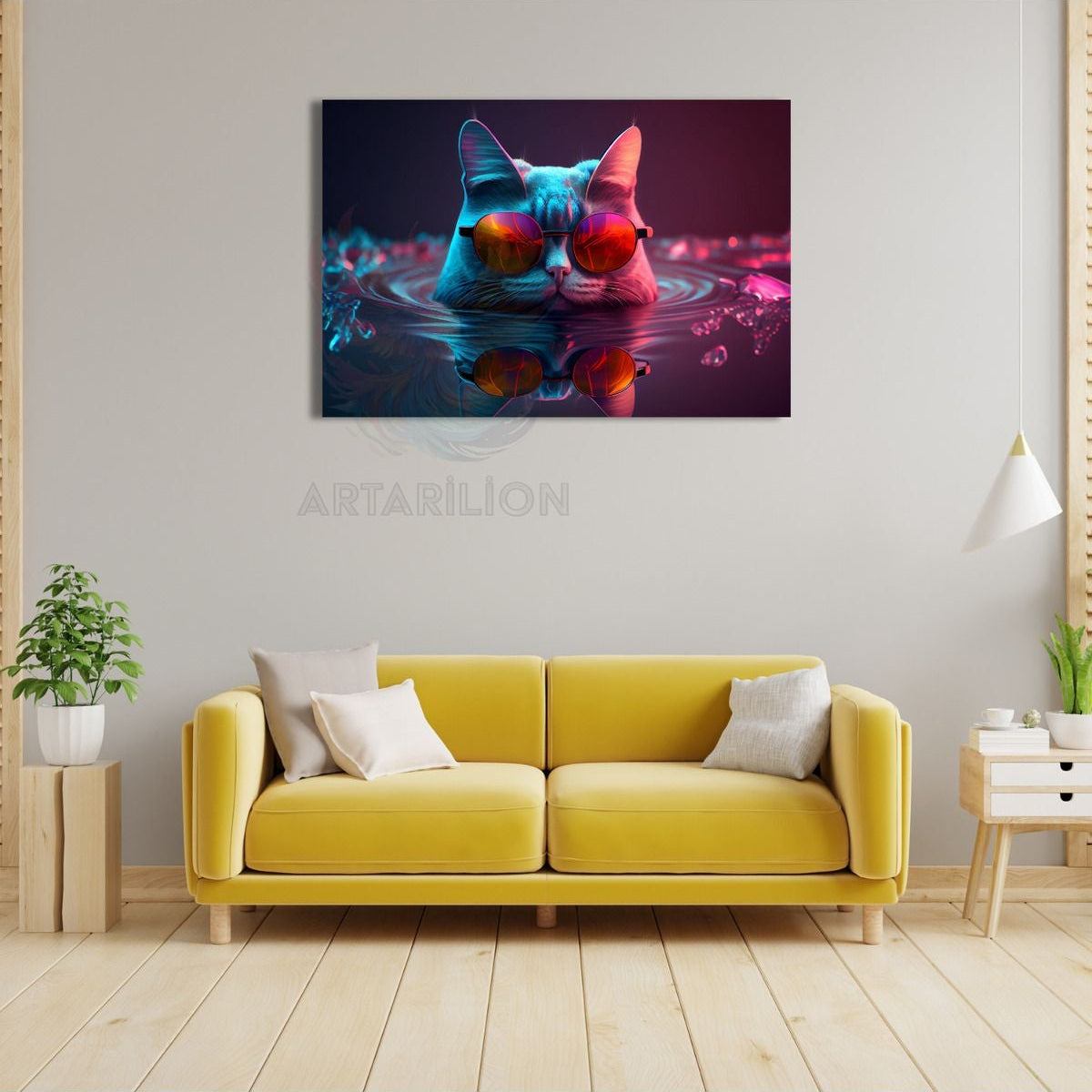 Gözlüklü Yüzen Kedi Tablosu Kanvas Tablo Salon Tablosu Yeni Ev Hediyesi