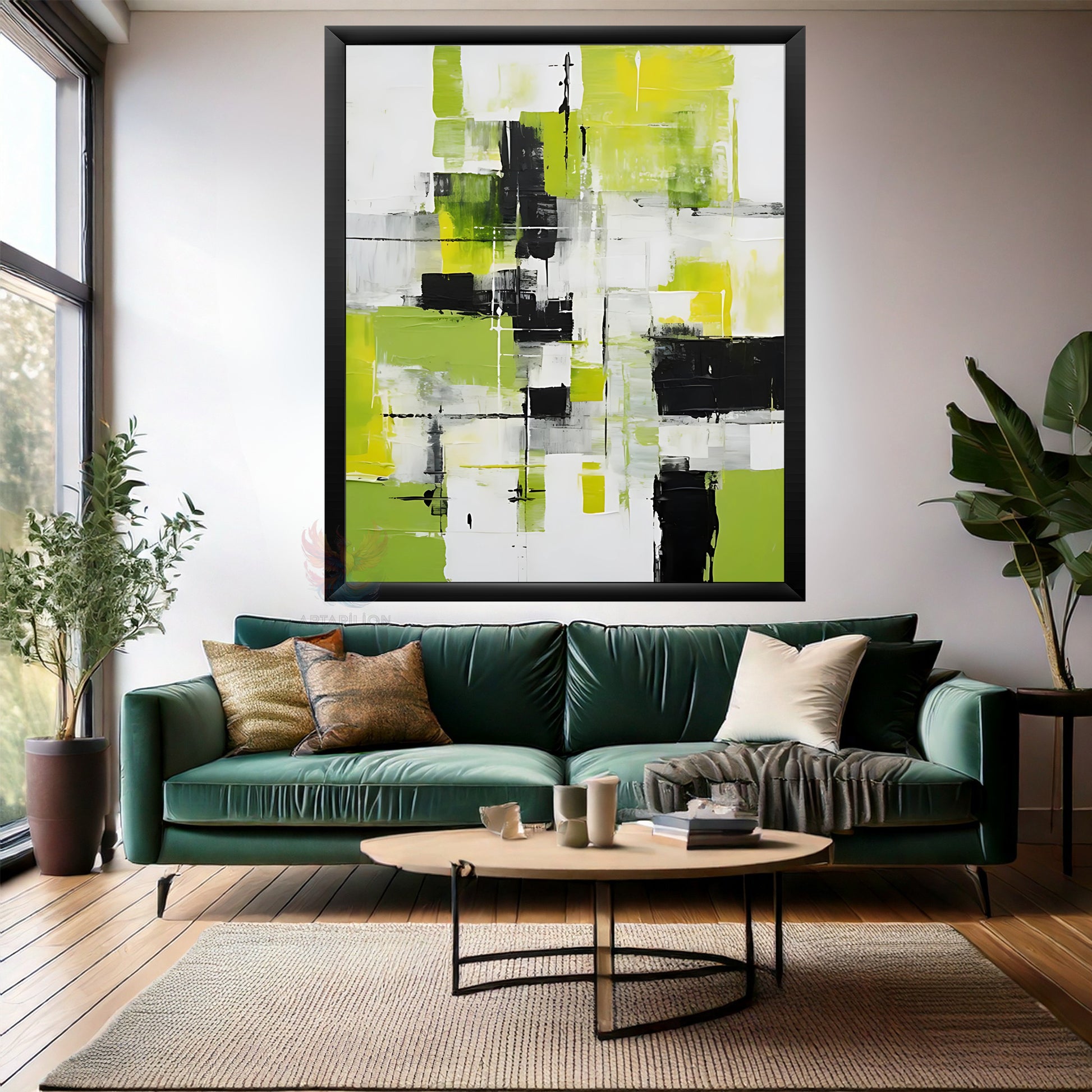 Yağlı Boya Görünümlü Soyut Ahşap Çerçeveli MDF Tablo Yeşil Siyah Fırça Darbeleri Salon Tablosu