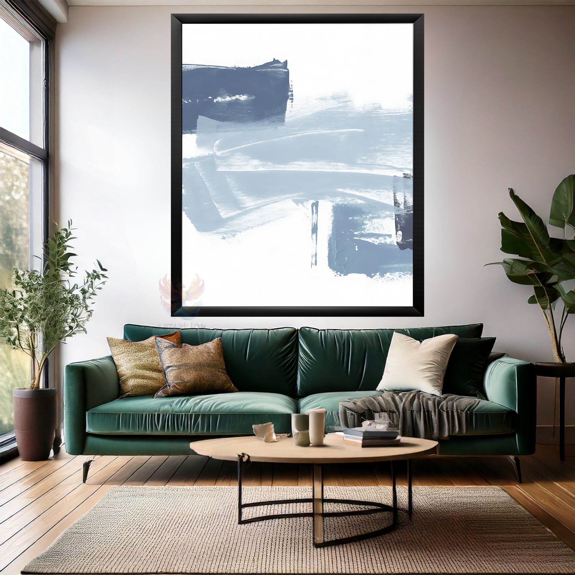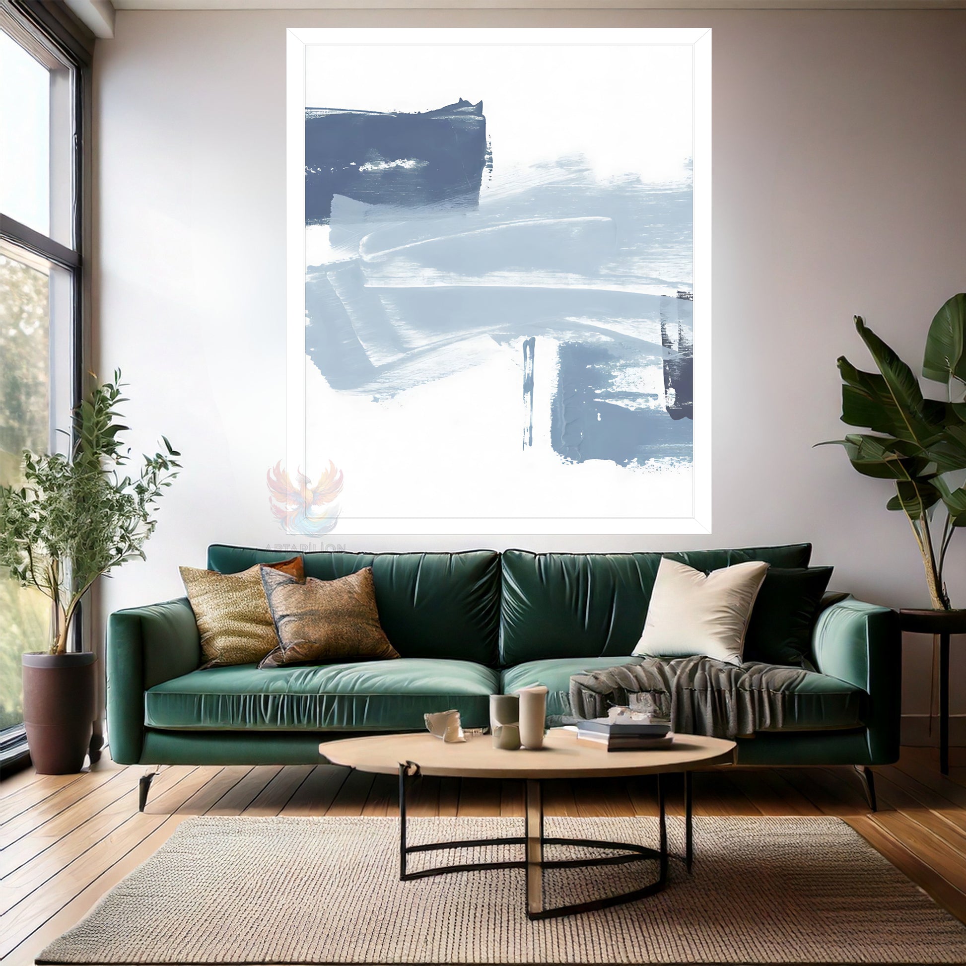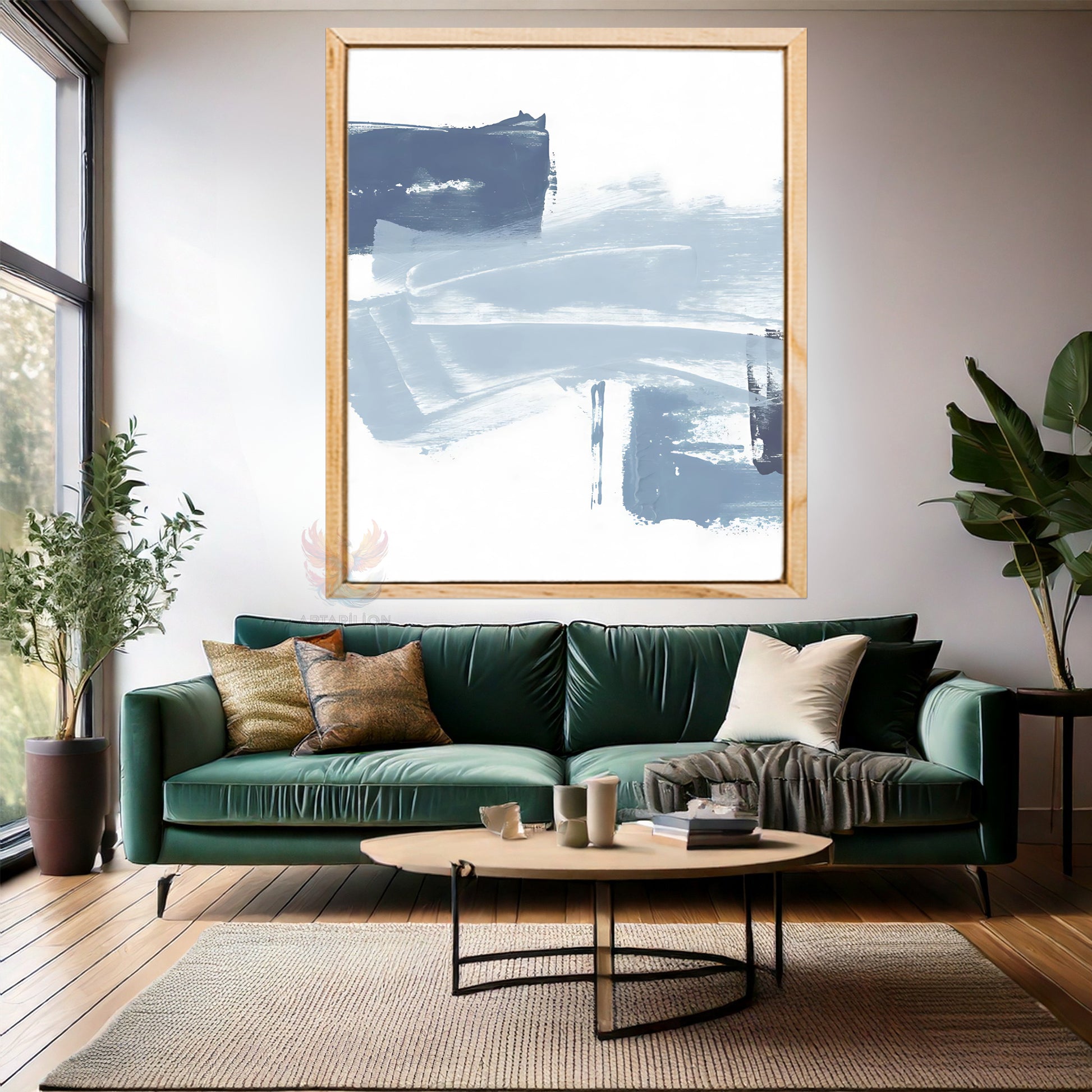 Mavi Beyaz Fırça Darbeleri Ahşap Çerçeveli MDF Tablo Soyut Tasarım Baskı Salon Tablosu